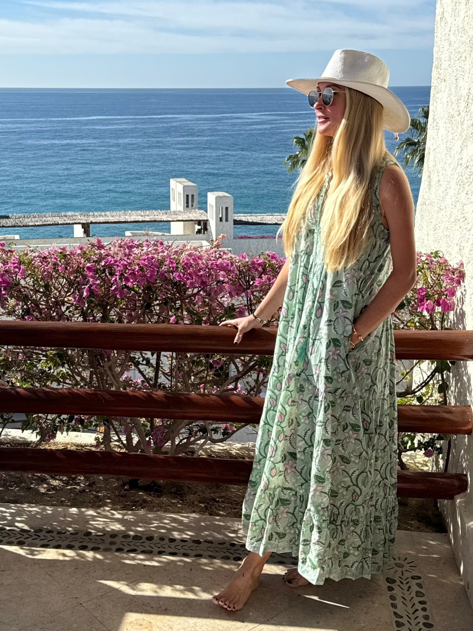 The perfect free-flowing, spring day dress. Ankle length and made from 100% Cotton, the ruffled details give this sleeveless, v-neckline dress an airy, feminine feel.