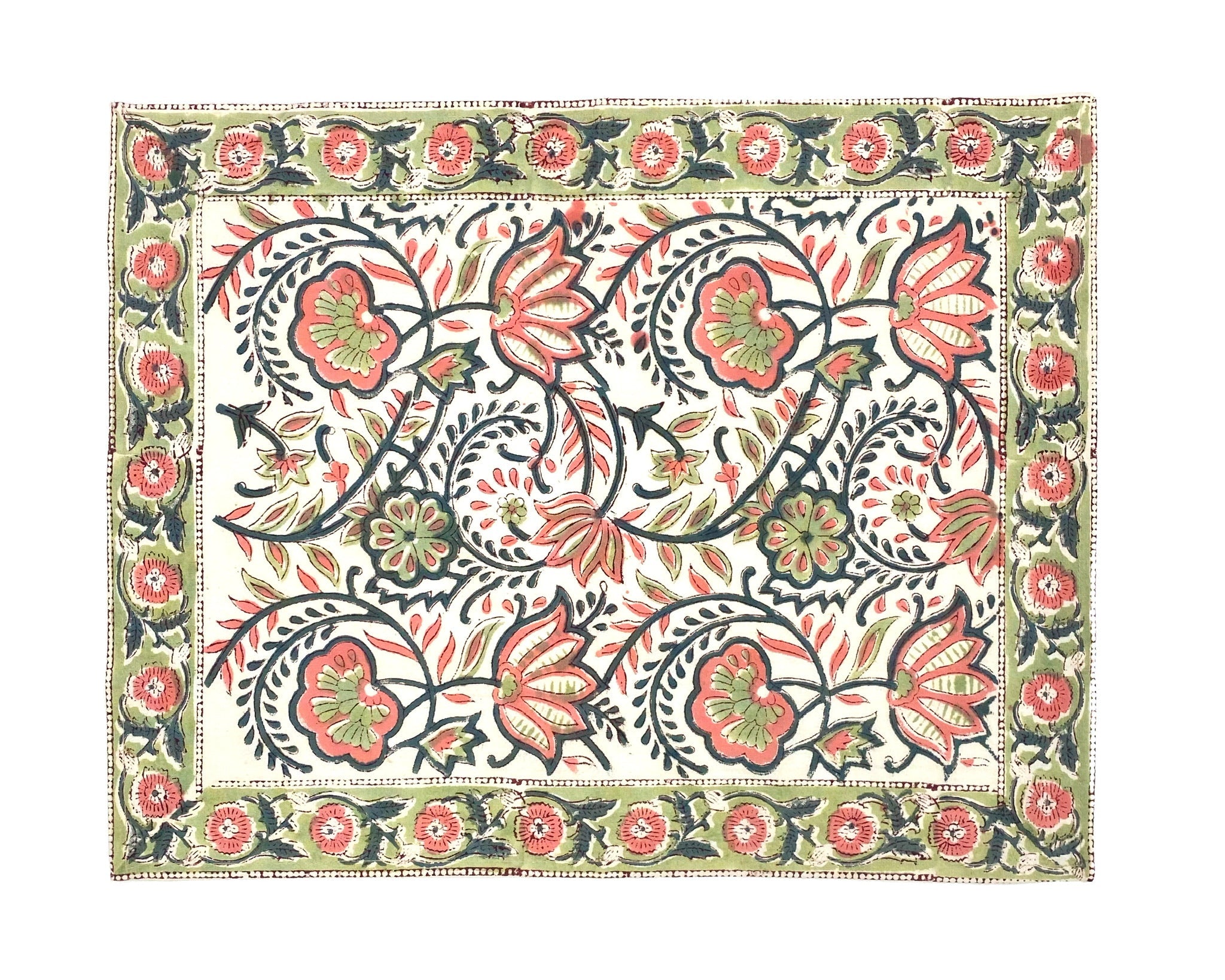 Beautiful hand blocked tabletop linens made with 100% cotton fabric. A must-have to enhance the ambiance of your dining space. Featuring timeless Indian Floral designs in various hues that all your guests are sure to enjoy!