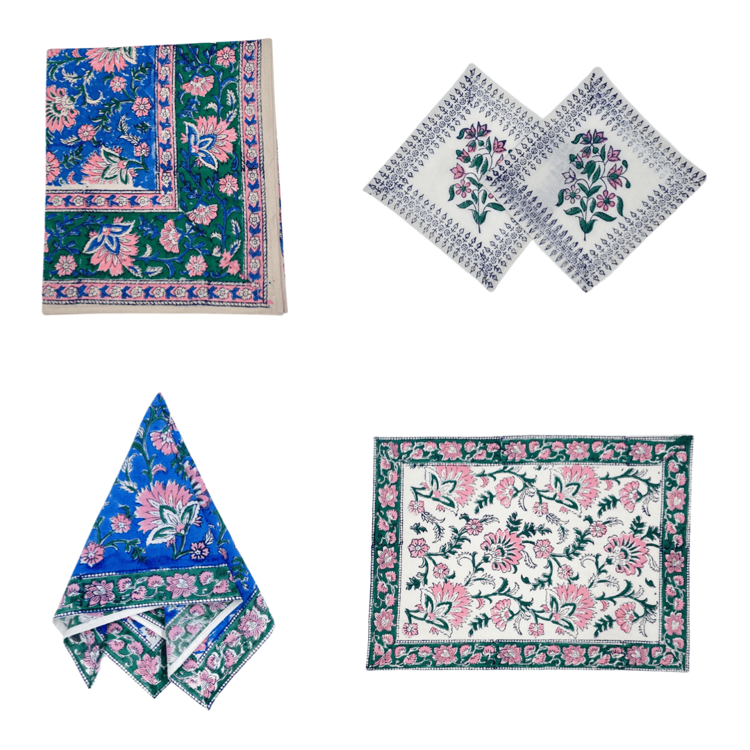Beautiful hand blocked tabletop linens made with 100% cotton fabric. A must-have to enhance the ambiance of your dining space. Featuring timeless Indian Floral designs in various hues that all your guests are sure to enjoy!